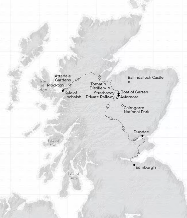 Edinburgh – Tåget börjar med att rulla genom Skottlands storslagna och historiska landskap, där eleganta Edwardianska interiörer i kashmir och tartan skapar en atmosfär av lyx och tradition. Du passerar charmiga städer som Perth, Dunkeld, Pitlochry och Blair Atholl, medan landskapet förändras från böljande kullar i Perthshire till dramatiska berg och dalgångar vid Aviemore, porten till Cairngorms National Park.