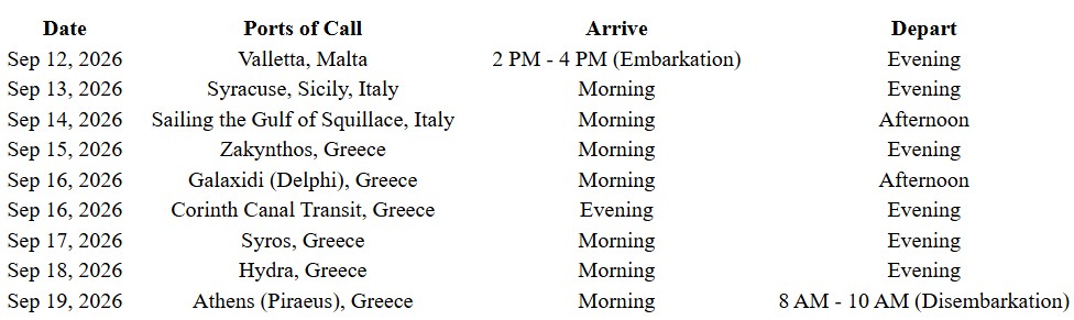 Malta-Aten via Korintkanalen 12-19/9 2026