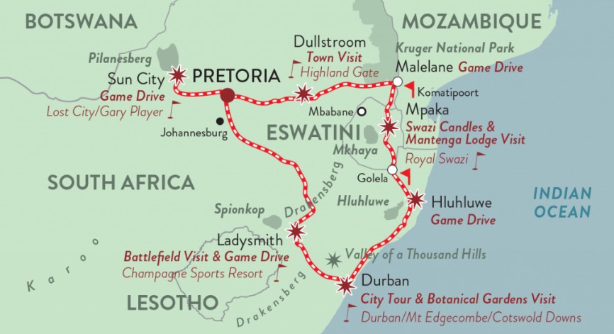 Genom Valley of a Thousand Hills når ni Durban med stadsrundtur och besök i botaniska trädgårdar, samt möten med lokala hantverkare som skapar vackra, dekorativa ljus för hand. Safarin fortsätter i Hluhluwe i Zululand, ett av Sydafrikas äldsta naturreservat, och i den världsberömda Krugerparken i Malelane, samt inkluderar ett besök i det kungliga eSwatini. I Dullstroom väntar konst, hantverk, introduktion till flugfiske och whiskyprovning. Resan avslutas där den började – i Pretoria – med minnen av golf, safari och naturupplevelser i världsklass.